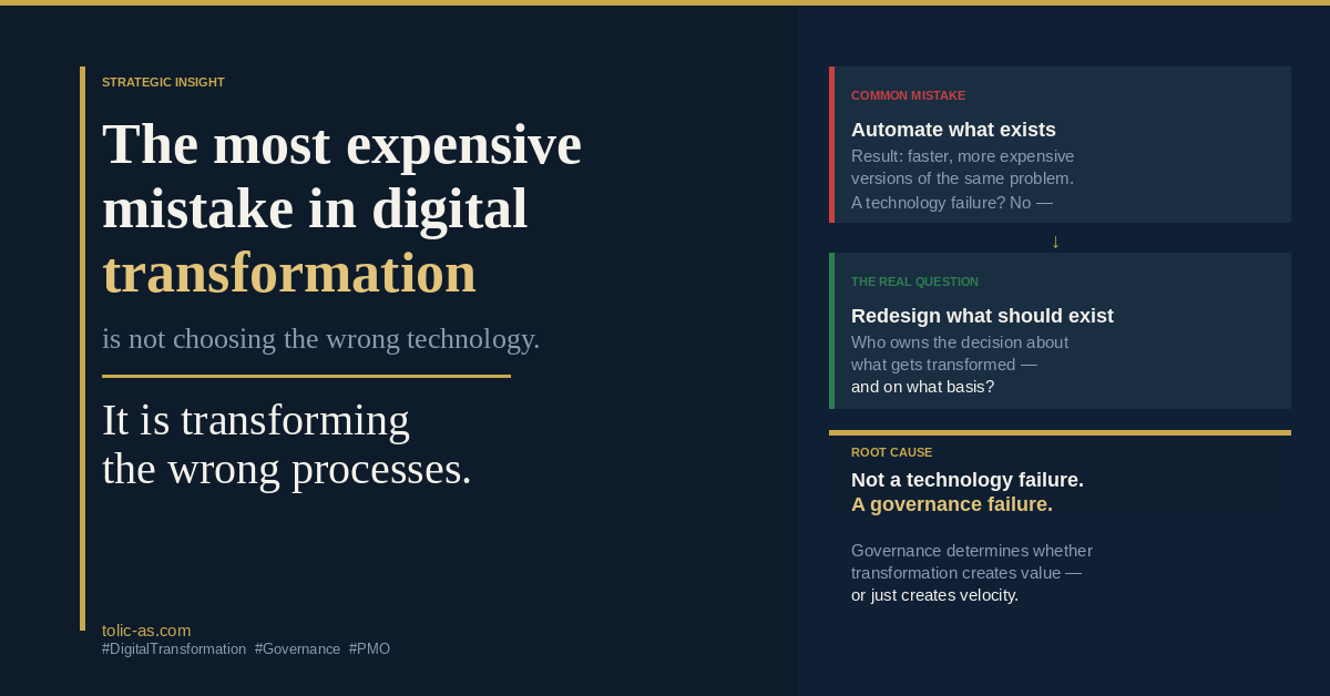 Den dyreste feilen i digitalisering: automatisere det som finnes — i stedet for å designe det som burde finnes. Vi kartlegger verdikjedene dine og bygger grunnlaget slik at innsikten systemene dine genererer faktisk blir brukt.