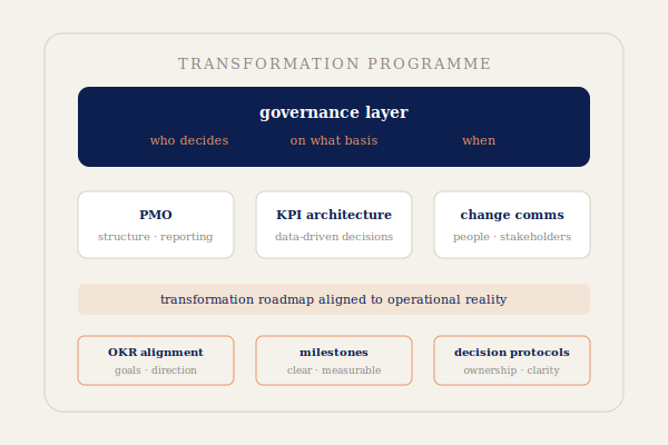 PMO-design og rapporteringsstrukturerKPI-arkitektur og beslutningsprotokollerTransformasjonsveikart og milepælerEndringskommunikasjon og OKR-tilpasning